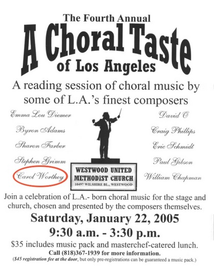 " A Choral Taste of Los Angeles " on Saturday, January 22nd, 2005 happens to be one of those rare and special artistic events that can only happen in a major center of art. Contrary to snobby views of Los Angeles as a cultural desert, the talent that lives and works in this diverse city is amazing. Case in point: all nine composers at this choral sightsinging bash were uniquely their own selves and the variety of works presented was rich.