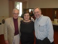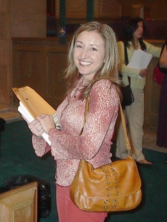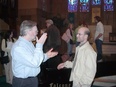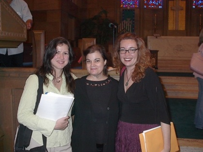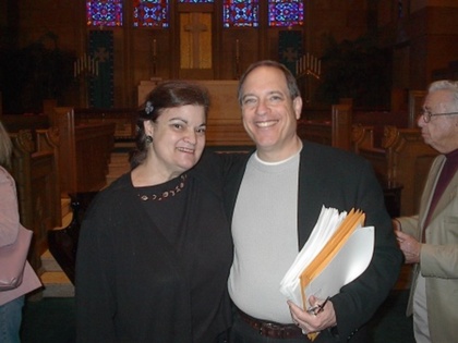 Sharon (pronounced Sha-Rohn ) Farber thrilled us with her "Ashkina" , a powerful major work premiered in Merkin hall, Kaufman Center, New York that incorporates evocative ethnic instruments. Another piece she presented, "My Beloved" , was premiered in her native Israel in December 2004. Byron Adams conducted his moving and beautifully-crafted work "Three Epitaphs" with sensitivity and the polish of years of experience. Paul Gibson regaled us with the benefits of wine in his lively, jazz-flavored work "In vino veritas" and then proceeded to present deeply religious pieces. Eric Schmidt gave us "The Lord's Prayer" , rhythmically utilizing the way people actually say those words as opposed to the artificial way the text is often set. Stephen Grimm took us on a "Summer Night" resplendent with soft chords and lush, colorful settings. The cheerful Cindy O'Connor belied her countenance by revealing a portrait of a morally bankrupt murderer in her pulsating musical theatre work "Crime" . William Chapman 's setting of "Shenandoah" was effectively lyrical and very appropriate for choirs across America. David O told us of how he created the surging evocation of "Many Waters" using the Biblical text that speaks of water as dangerous (as opposed to our modern concept of water as soothing)--then the Tsunamis occurred and he was shaken a bit and just now returning to complete the work.