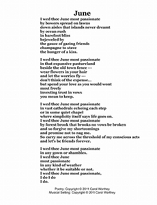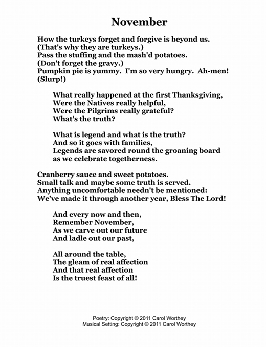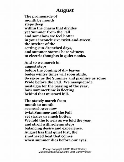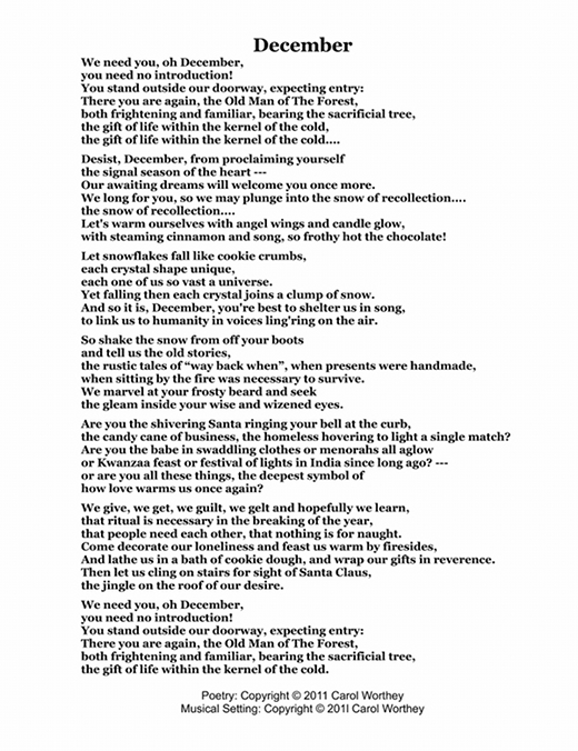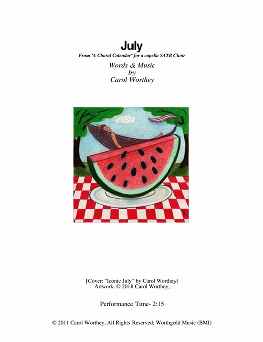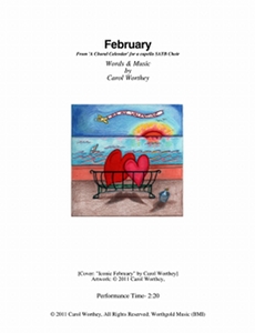Composer/Painter/Writer Carol Worthey is proud to announce the "birth" of a new major work for choir: Twelve musical portraits of each month painted in musical colors and textures that depict the characteristic moods, changing weather, special holidays and unique feeling of each month. "A Choral Calendar" is a uniquely flexible work in its performance possibilities: It is designed to function enjoyable as a whole concert piece, with each stylistically distinct month flowing one to the next until an entire year is portrayed in music, in artwork and in verse. It is also a multi-faceted set of pieces, each unique, that can function with each month being performed by itself as the year passes, or for special occasions such as a Holiday, a Wedding or to celebrate a Birthday during any particular month.